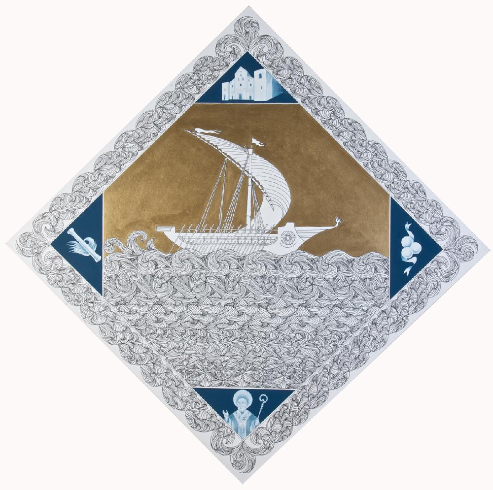 Il linguaggio grafico, accurato, meticoloso riporta alla tessitura di una tela arricchita da un prezioso ricamo, dove la mano abile della ricamatrice ha guidato con maestria ago e filo, realizzando una tessitura animata da linee, forme e colori.